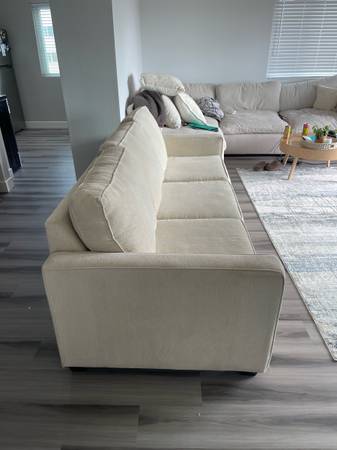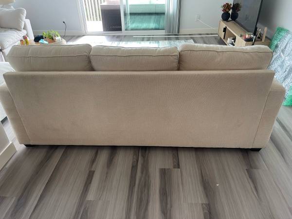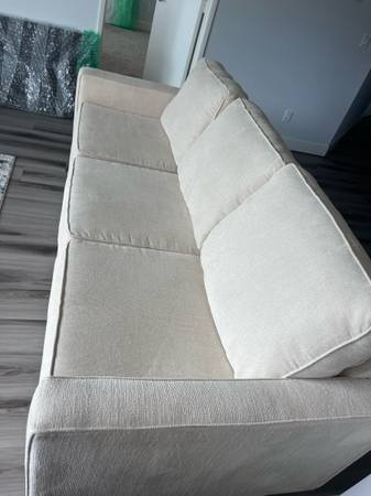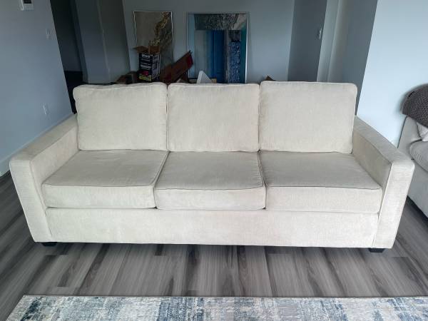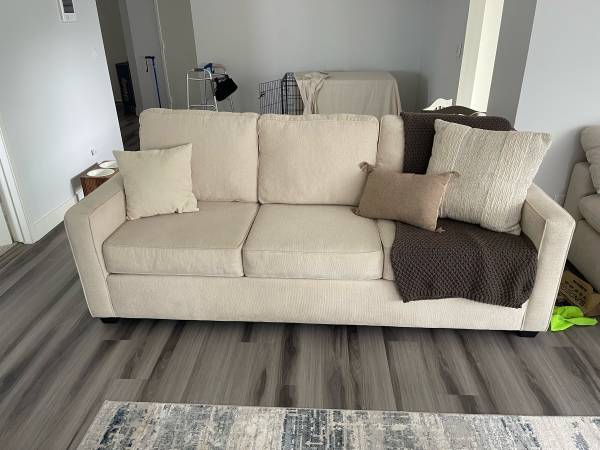 Cream chenille couch from living spaces. The couch is in perfect condition, the couch was hardly used because I was never home. Bought in 2024, it’s only a year old.