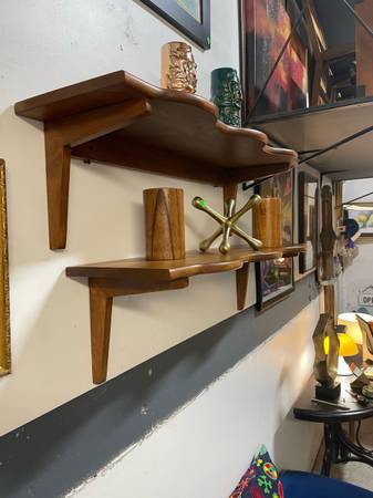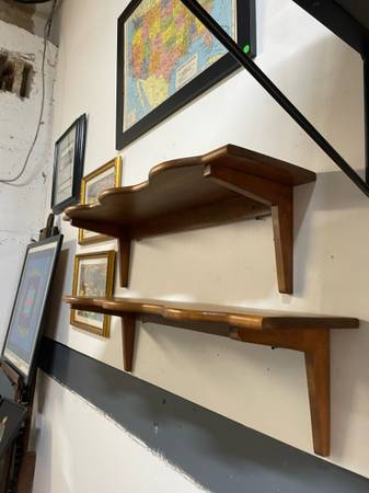 $175 EACH. Custom crafted solid wood shelves with walnut finish, a Danish design and wavy front for a modern look. They measure: 31” Long x 11” Wide x 5/8” Thick $175 EACH.