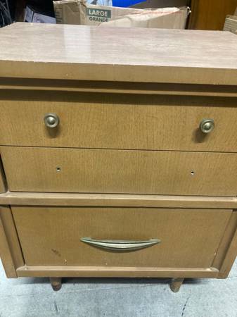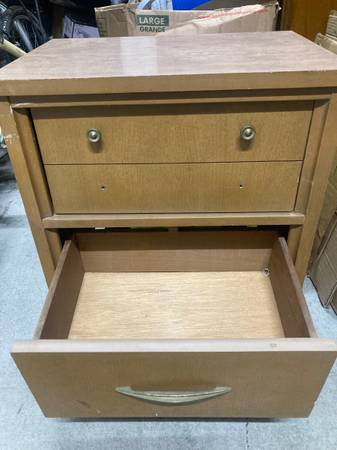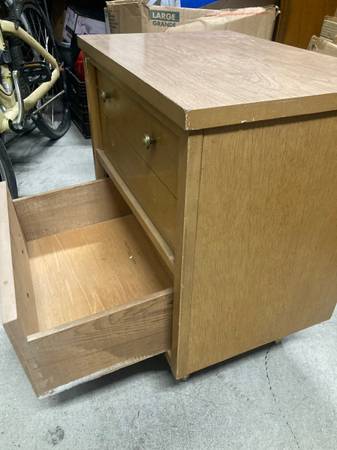 Night Stand/End Table, solid, wood, vintage, 50s, two drawer, quality, round legs, easy open. Please call .