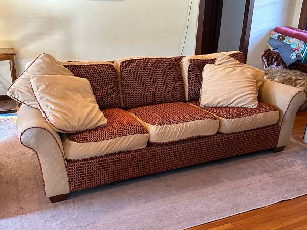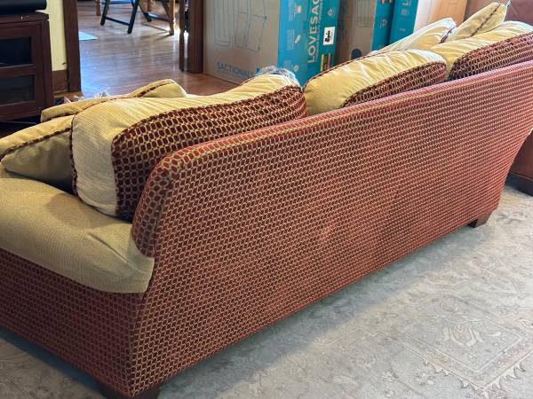 We have a 20-year-old Vanguard Furniture sofa. It has some small, light staining on the arms but is in good shape otherwise considering its age. This was a custom ordered sofa so the fabric is unique.