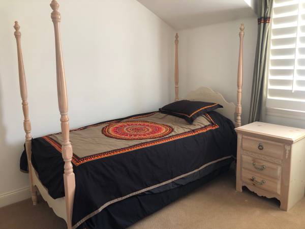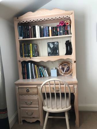 Young girl’s bedroom set with a single bed, one nightstand, one desk with book shelf, one dresser with mirror & a matching chair in excellent condition. Dresser - 52 inch L & 18 inch W.