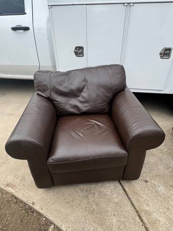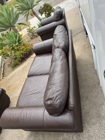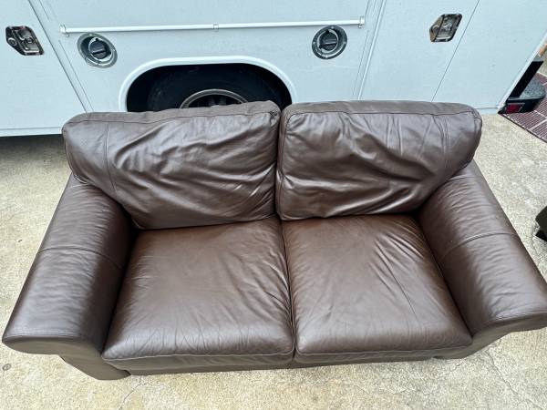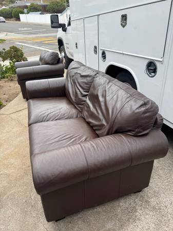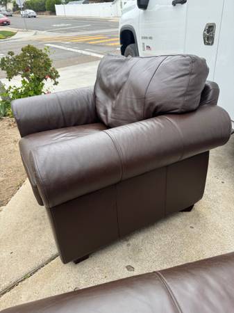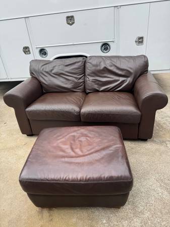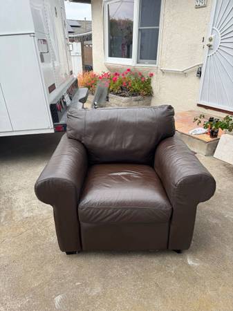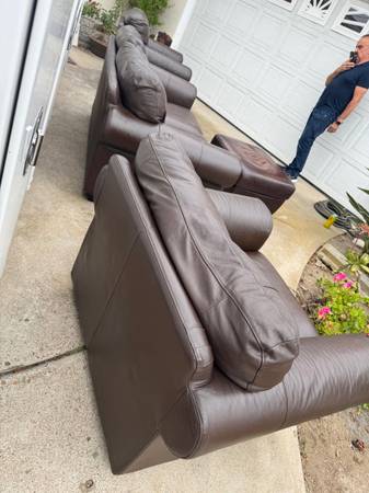 Genuine leather sofa / couch set with 2 armchairs, loveseat and ottoman. This is a leather couch set from ikea that’s about 10 years old kept in great condition in a non smoking and low use environment. Light scuffing but no rips/tears/ holes.
