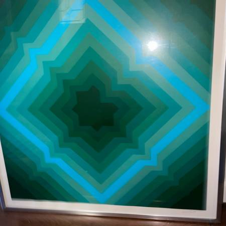 This is an original photolithograph by Jim Bird, paying tribute to Vasarely in 1972. The artist has signed this piece and it comes framed and matted. The size of the artwork is medium and it is an excellent addition to any art collection. The style of the piece is similar to that of Vasarely, making it a great conversation starter. It is an original piece, not a licensed reproduction. It measures 27.5 by 27.5. It is signed in pencil and numbered 73/75.