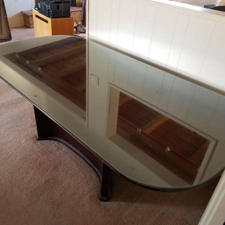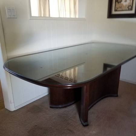 Large executive desk with tempered glass top. In pictures shown as table, but original use was single drawer executive desk with the legs attaching to the outside radius.