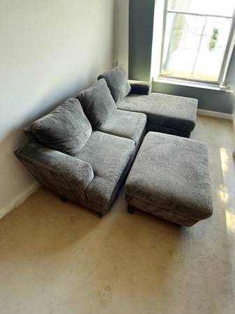 This Living Spaces sectional is ready to find its new home! It's in fantastic shape and includes a storage ottoman – perfect for stashing blankets, games, or anything else you want to keep out of sight. This comfy couch is ready to bring both style and functionality to your living room! 🙌🏻 🤩
