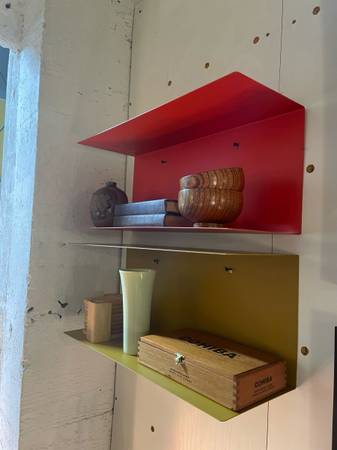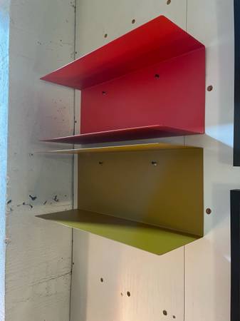 $150 EACH. Vibrant mustard yellow and orange floating wall shelves. They have been custom made so they are unique. Have three of each color. They measure: 22” Wide x 7.5” Dp x 9.5” High. EACH shelf...