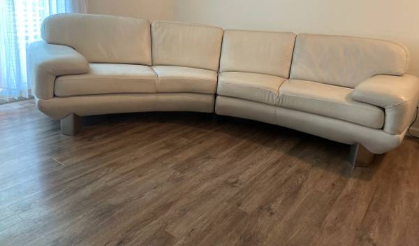 2-Piece Curved Leather Sectional Sofa in great condition. It has a sleek design with wide armrests and sturdy metallic legs, and it sits nicely on wood-look flooring in a corner space. Very comfortable and well maintained.