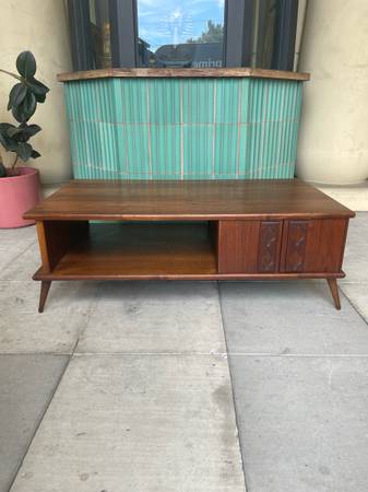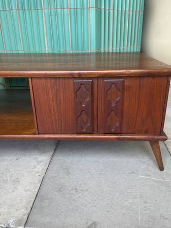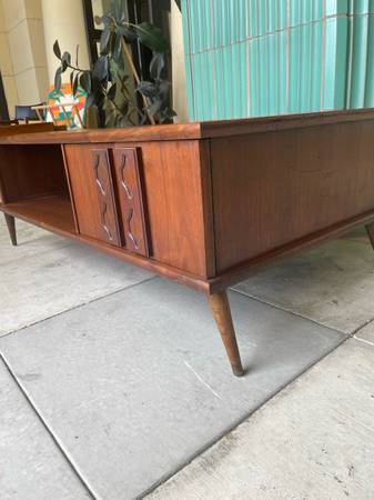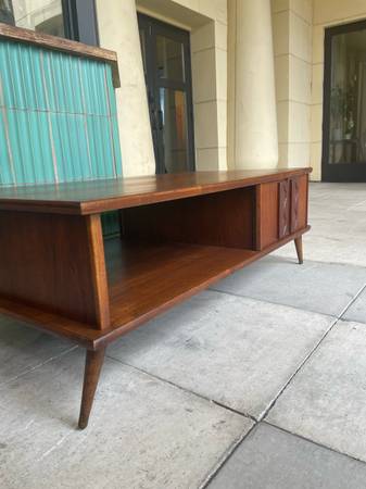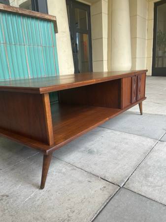 Mid century Oversize Coffee Table / Media Console, low profile, made from walnut with bottom tier that has 2 side doors plus slanted legs. Is in good “as found” condition. The dimensions are: 54”...