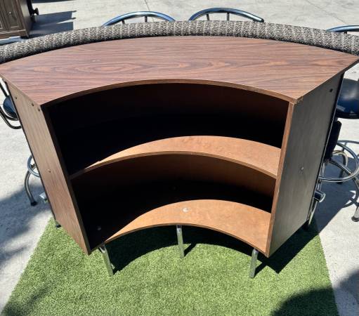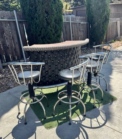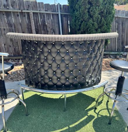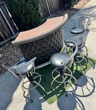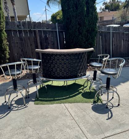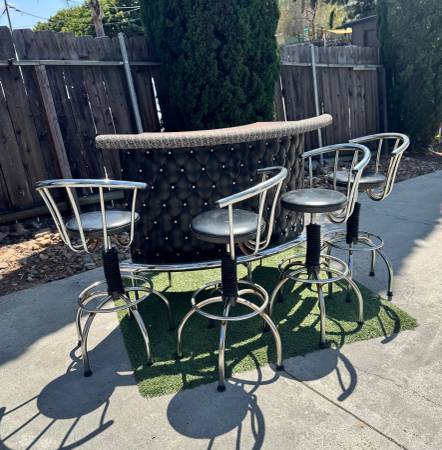 5 piece Mid-Century Modern vintage cocktail bar set features a stylish curved dry bar with a tufted black vinyl front and ample hidden storage. Optional wheels make it easy to move, offering flexibility for entertaining in any space. Complete with four black and chrome swivel bar stools with adjustable height, it’s a perfect blend of retro sophistication and modern function. Delivery available for extra fee or North Park pickup.