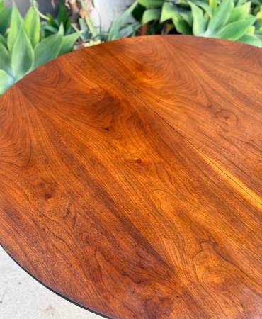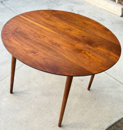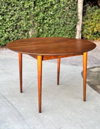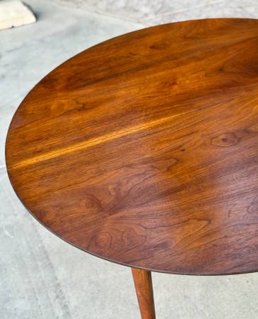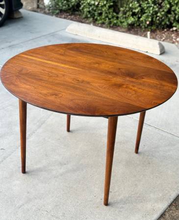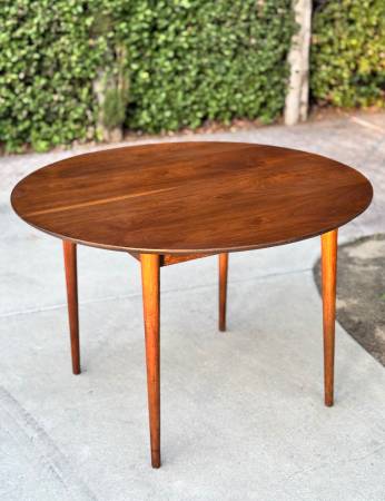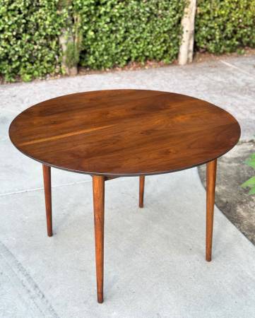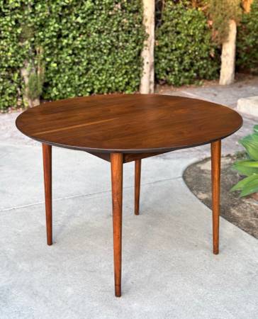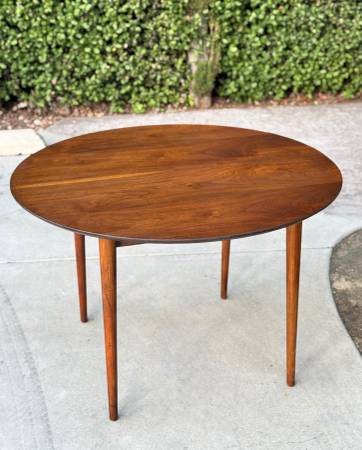Gorgeous vintage 1960s round dining table by BP John showcases a rich walnut finish and beautiful wood grain that highlights its timeless mid century charm. Made in Portland, Oregon, it comfortably seats four and reflects the quality craftsmanship the company was known for. Solid wood construction and classic tapered legs complete its elegant, enduring design. Delivery available for extra fee or North Park pickup.