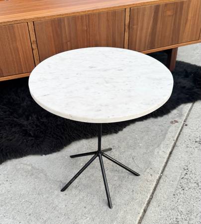 Mid Century Modern round side accent table features a solid travertine marble top, adding a touch of elegance and timeless appeal. The metal spider leg base offers both stability and a sleek, stylish look. Perfect for any living room or entryway, it combines functionality with sophisticated design. Delivery available for extra fee or pick up is in North Park.