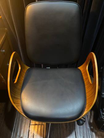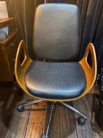 Excellent condition, sleek black leather and lacquered wood desk chair, mid century modern style with roll feet. Measures at 21” width, 18” seat depth, 34.5” back height, 26” armrest height