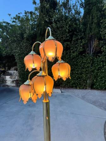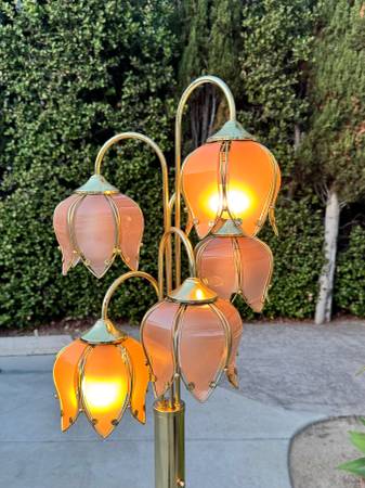 Gorgeous mid century modern Hollywood Regency 5'4" floor lamp from the 1980s showcases a gorgeous lotus flower design with delicate pink glass petals. The brass base shows light wear, adding to its authentic vintage character, while all glass petals remain intact. Featuring a 3-way switch for adjustable brightness (2, 3, or all 5 lights), it works great and brings a warm, elegant glow to any room.
