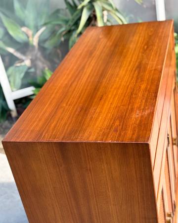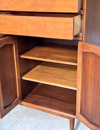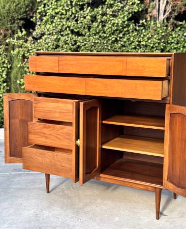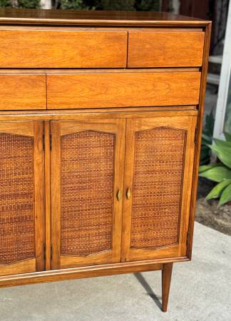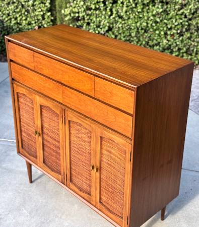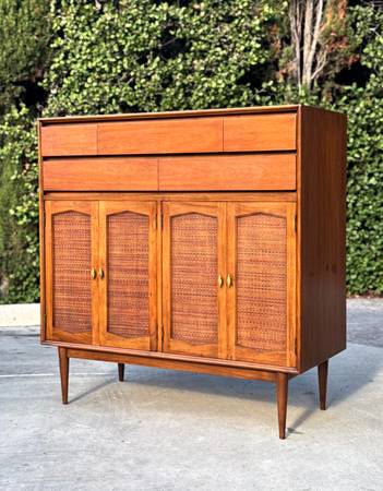 Large mid century modern R-Way gentleman’s chest features a stunning walnut finish, cane front doors, and solid brass handles for a timeless, elegant look. With eight smooth-sliding drawers and two adjustable shelves, it offers ample and versatile storage to fit your needs. A rare and hard-to-find piece, its tapered legs and classic design make it a beautiful standout in any home. Delivery available for extra fee or North Park pickup.