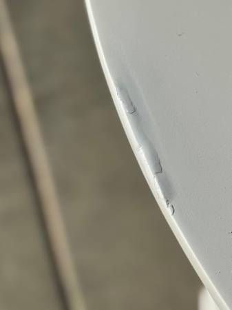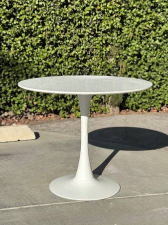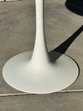 Mid century modern style white tulip pedestal dining table combines classic elegance with a clean, contemporary look. Its round design comfortably seats four, with chairs that tuck in neatly to maximize space. Showing light signs of use and wear, it remains a beautiful and timeless centerpiece for any dining area. Delivery available for extra fee or North Park pickup.