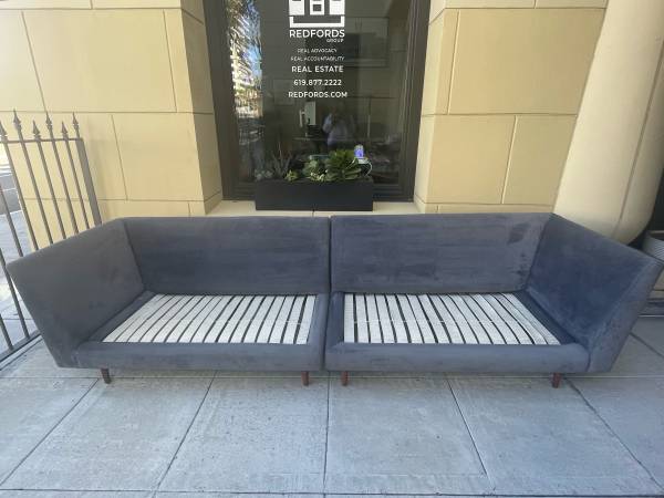 Mid century two piece streamlined sofa with a low profile silhouette and comfortable cushions.
