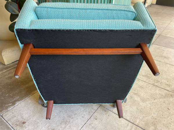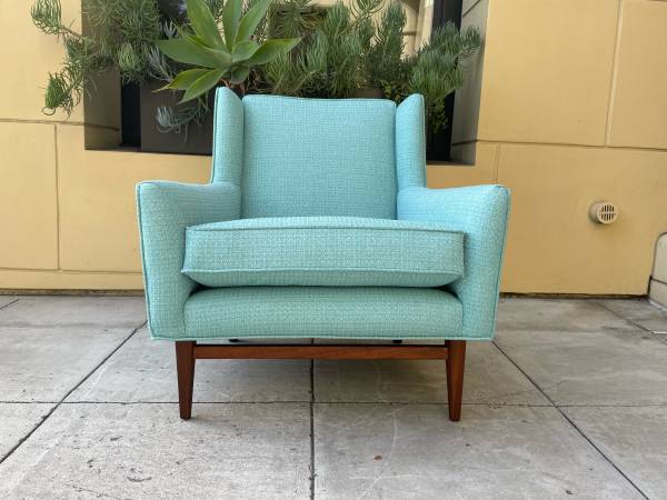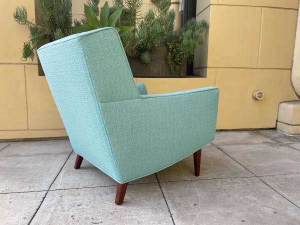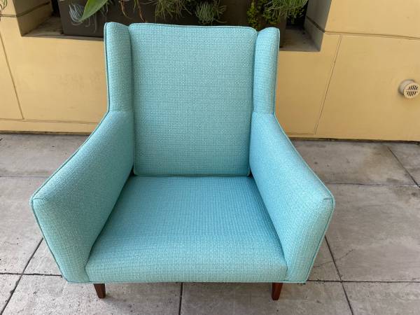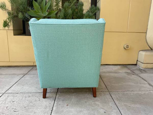 Mid century Lounge Chair with wingback and walnut wood legs. Great design and new upholstered linen fabric, light turquoise with a mix of grey and green threads. Great looking and comfortable feel....