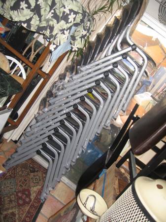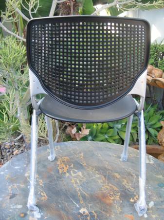 Black with silver frames. These list for over $230.00 each new and this is new. This attractive and comfortable chair is the perfect fit for almost any application....reception areas, guest or side chairs, training / conference rooms or any multi-use application. Add a comfortable and stylish seating solution to your office, lobby or waiting room when you choose this KOOL stacking chair. This chair is easy to clean and won't damage your floors if it's repositioned, leaving your space looking pristine. Overall Dimensions: 31"H x 22"W x 21"D. Weight capacity tested to support 400 lb. Perforated back provides comfort and allows air to flow through Polypropylene seat and back are durable and easy to clean. 15-gauge steel frame offers rugged stability. Non-marring floor glides protect floors from scratches. Permanent ganging attached to each chair. Chairs can be stacked 15 high to maximize your storage capacity. Save time - no assembly required.-If interested leave a call back number for quicker response---