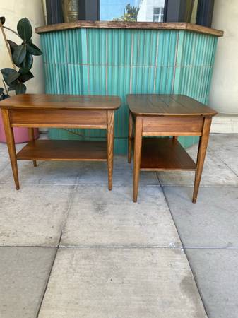 Mid century PAIR of Nightstands / End Tables by Stanley Furniture made from walnut with ash wood legs and burl wood top surface insert, a handy drawer and bottom tier/shelf.