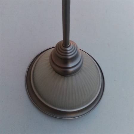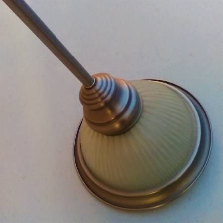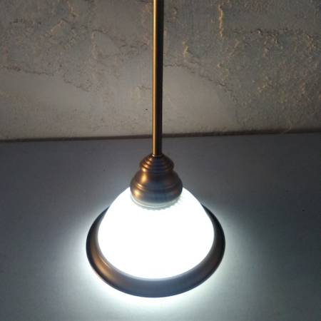 This classic vintage pendant light is a great addition to the kitchen or any other room. It has a decorative frosted glass shade with a metal trim to provide needed illumination. The mounting deck is 1.5” high and 4.875” wide which can be mounted at an angle up to 90 degrees from vertical. It comes with three 9.5” rods and the height of the pendant can be adjusted by using 1 to 3 rods. Maximum overall height is 37". Clean and in good working condition. $20. Light bulb is not included but any standard bulb would work.