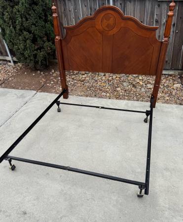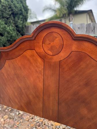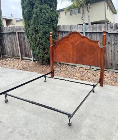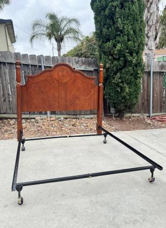 Elegant Victorian style mahogany queen bed frame features a beautifully carved scalloped top and a detailed inlaid medallion on the headboard. Crafted with classic charm, it includes the metal bed frame and hardware needed to securely attach the headboard. A timeless piece that brings warmth and sophistication to any bedroom. Delivery available for extra fee or North Park pickup.