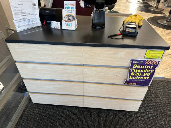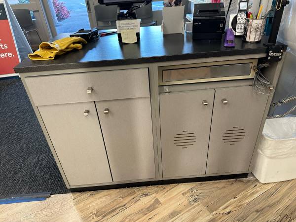 Front reception desk with drawer and cabinet. Lots of storage. Desk is in great shape. $30