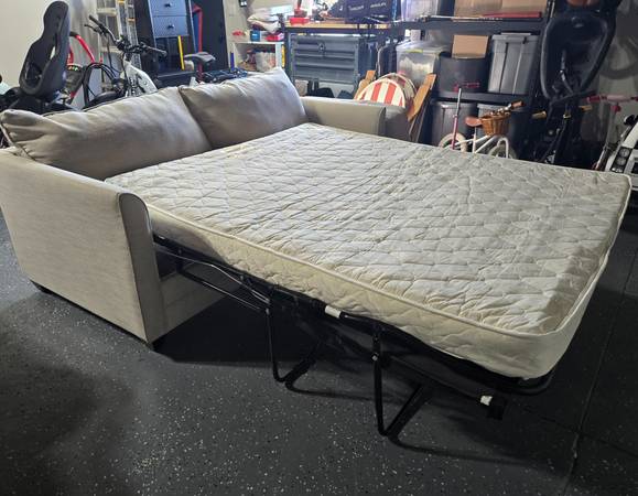 Full size sofa sleeper. A spring in the folding mechanism has broken, so it does not fold as easily as when it was brand new, but it still opens and closes fully. The sofa is about 5 years old and in great shape, was in our office/spare bed room. I cannot deliver but I can help load it in Pacific Beach. $60 or best offer, cash or Venmo.