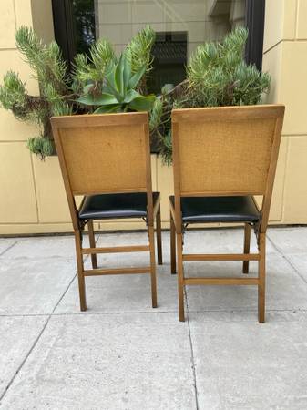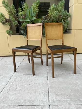 Vintage Leg-O-Matic chairs with wood frame, cane back and black vinyl seat.