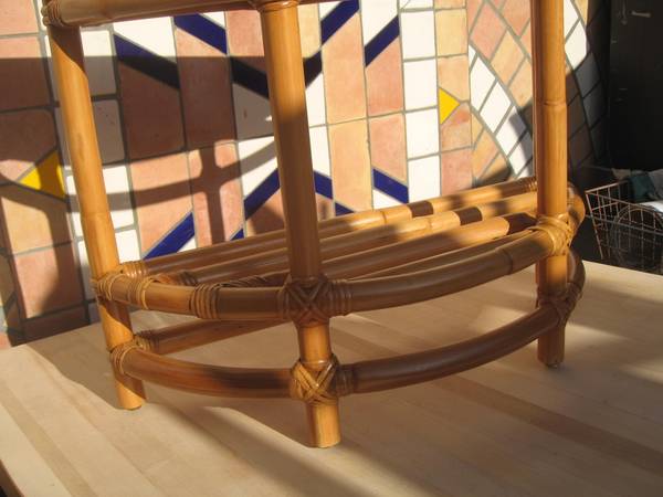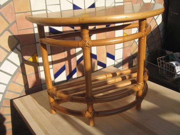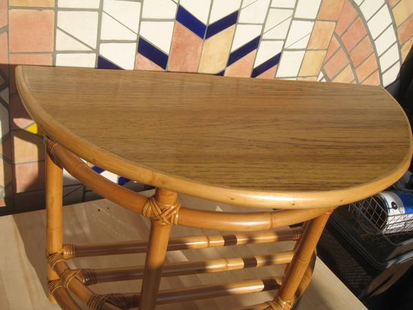 Local San Diego piece from La Jolla Rattan Circa 1960's. Half Round Demilune Rattan Side Table With Ladder Sides and Woodgrain Formica Top. This is a rare find and has been meticulously restored by a professional to it original condition. These average over $550.00 online unrestored. If you appreciate a unique piece of San Diego's history this might be for you. Price is firm, still has original tag "La Jolla Rattan". Measures 29'' wide x 22'' tall and is 14'' deep at the widest point.---if interested leave a call back number for quicker response---