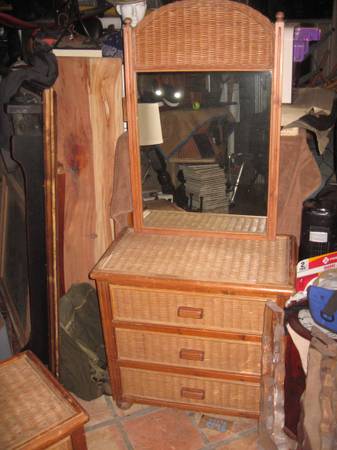 Vintage wicker and rattan dresser with matching mirror, side table with lamp. In good vintage condition with normal wear. Dresser measures 32'' wide x 18'' deep and 30'' to top of dresser. Night stand measures 21.5'' wide x 18''deep x 22.5'' tall.---leave a call back # if interested---
