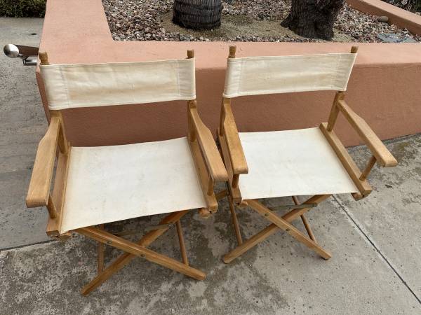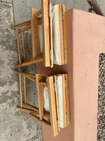 Two wood director chairs with beige canvas seats. Replacement canvas are cheap to buy if want new ones and different color. 21 1/2" W x 16"D x 34" H