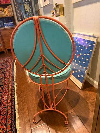 William Wesley Peters chair for Taliesin Architects designed for the Delano Mortuary, CA circa 1966, inspired by Frank Lloyd Wright's earlier designs for Midway Gardens and Taliesin West, each having a circular turquoise seat and back, supported with the salmon metal frame, 35"h x 19"w x 23"d