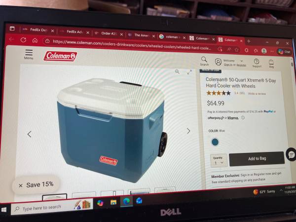 COLEMAN 50 quart cooler in excellent condition. 7” wheels. Retractable handle. Drainage plug. Blue/white. 15.00. Save 50.00
