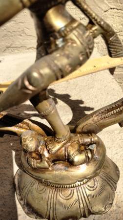 This intricately crafted brass statue depicts Lord Shiva in his iconic Nataraja form, performing the Ananda Tandava—the cosmic dance of bliss. Measuring approximately 9.5 inches tall, the piece shows signs of age, including visible metal erosion and corrosion, as shown in the photos.