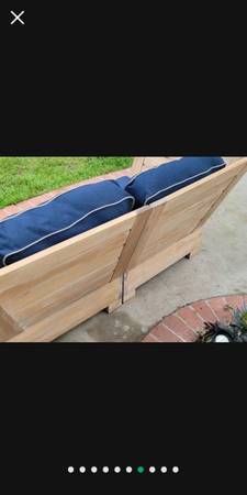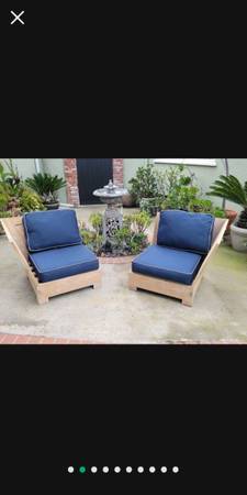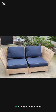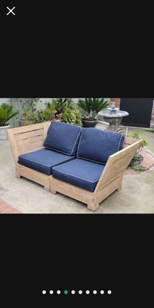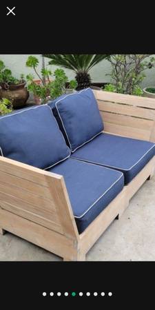2 Restoration Hardware Grade A Teak Sectional Corner Unit Deep Seating Lounge Chairs that when placed together it turns in to ideal loveseat... Modern design and quality built. Like new condition, recently power washed, sanded smooth and oiled/sealed. Loveseat measures 66"L x 33"D x 29"H. Included are 4 thick navy blue cushions w/ zippers and piped seams. These chairs sell new for more than $1,200 each. Selling both for $590