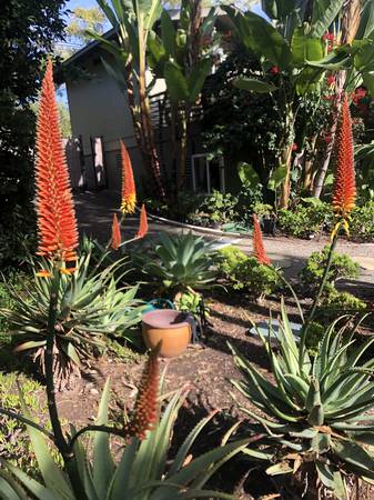 Spectacular blooming large ALOES - 3 ft tall (once planted in ground). Available now in 15 Gallon containers. A Spectacular bloomer - w/red, orange + yellow flowered stalks. Truly a rare ALOE variety - yet Aloes are easy to grow and maintain. They can evolve into small trees over time with their show-stopping Winter blooms. Only 3 large Aloe plants remaining - each about to bloom for holidays. They are content either in ground or in a pot. $150 each.