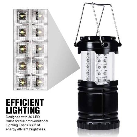 This LED camping lantern includes 30 individual low powered LED bulbs, omni directional 360 degree light emitting design for a longer lifespan. Light up to 12 hours of regular, continuous use with enough battery capacity (AA battery included)