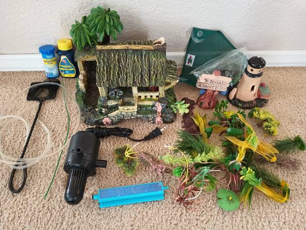 Various aquarium fish tank supplies: Decor and Misc supplies - $1-$5/each (3) NEW Accuclear bottles - $10/each Large filter - $13 Small filter - $7 Power jet - $5 Call / text 619-347-073six
