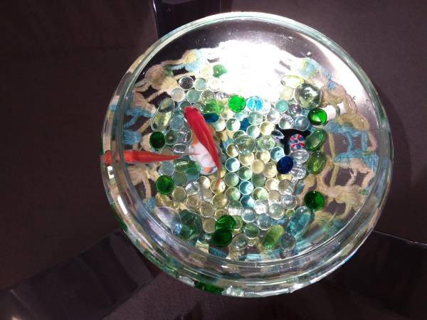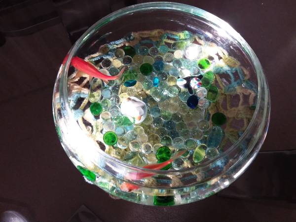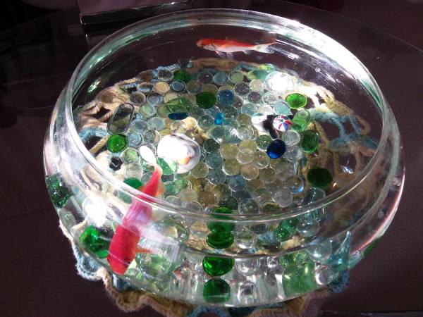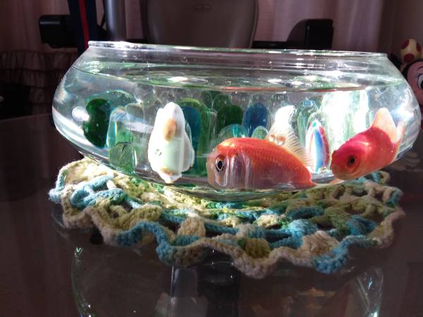Glass bow for fish is so nice in perfect condition. sale for $12 includes: green + clear rock with ceramic tiny duck and seal decor the size of glass bow is 10,5" diameters x 4,5"H ( 8" diameters on...
