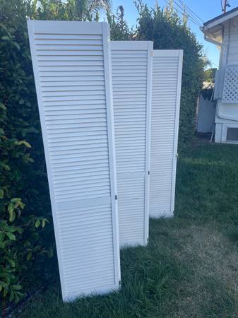 3 Louvered Interior Closet Bi-fold Doors. Hardware included. Dimensions: 35.5” W x H = 79” 80” with pins Color: White Material: Wood All THREE doors for $75
