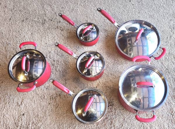 This is a set of KitchenAid non-stick pots and pans, with lids. They are in great condition and are perfect for new arrivals or transplants, like recently deployed to San Diego military families.