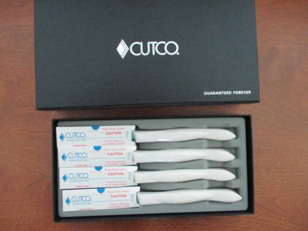 Brand New Cutco Knife Set of 4, received as a gift and never used. Current online retail price $222. Pearl handles, model #1759. Cutco calls this a table knife but it is so sharp and serrated, it works extremely well as a steak knife, too. All Cutco knives are US-made and covered by their lifetime sharpening and replacement guarantee, called the Cutco Forever Guarantee (see www.cutco.com for info). They back up their products no matter how you bought them or if you got them as a gift. Excellent quality. We already have other knife sets and so are letting these go.