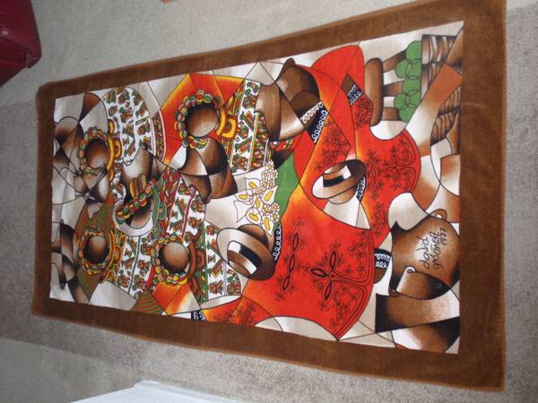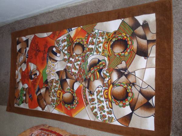 NEW, never displayed, signed Ordonez print on beach towel/wall hanging. By the late Guatemalan artist, made in Salvador, never used or displayed. Has been put away by a family member from Salvador. There is one on ebay that is pre-owned, not dated, and would cost almost $75. Mine is dated, 1977, below the signature. 66" x 34"