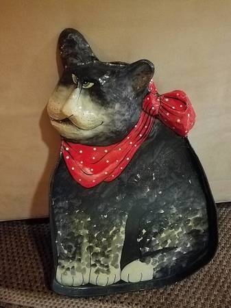 Kliban style cat tray to hold perfumes, guest towels, serve cookies or attach to wall. Hand painted tray with a 3-D raised design. Large item 26"h 17"w sticker on back Habitat International in...