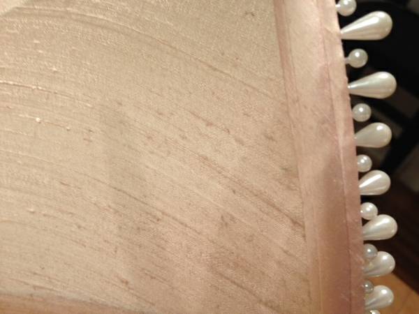 Light pink silk lampshade with faux pearl teardrops-alternating tear and round shapes-with fringe. Top diameter is 6.5", bottom diameter 12", and vertical height 8". Good condition.