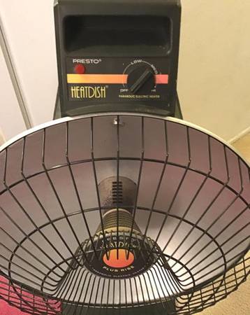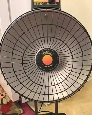 Parabolic Presto Heat Dish Plus Rise with Adjustable Stand and Thermostat Control Heater. Presto’s HeatDish® parabolic electric heater uses a computer-designed parabolic reflector to focus heat, like a satellite dish concentrates TV signals. You feel three times the heat of 1500-watt heaters, yet use a third less energy so that the heater can pay for itself in as little as one year. Infinite heat settings provide the warmth you desire. Safeguard Protection - Turns off automatically in case of tip-over. A warning buzzer sounds if heater is jarred or tipped while energized.