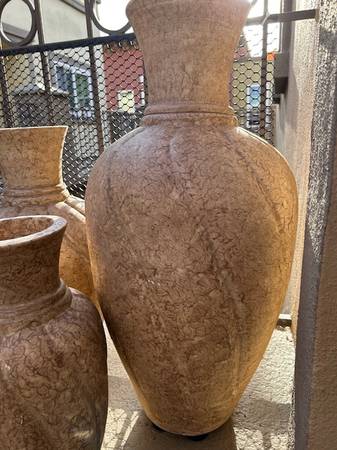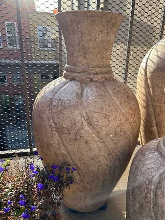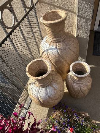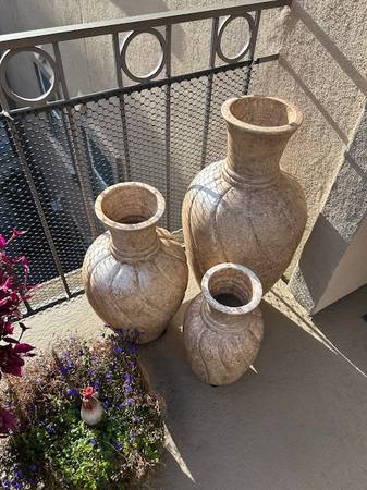 Set of three very large resin/composite planter type urns. May be used indoor or out.