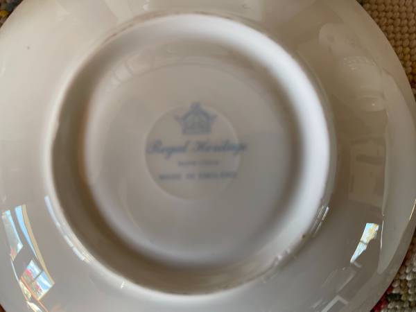 ROYAL HERITAGE brand. Fine China made in England. Cup measures 3” tall x 3” wide at top. Saucer is 6” wide. No pattern names on bottom of all three. See pictures. Mother from Bristol, UK has lots of tea items Spare cups not needed anymore. Questions or comments please. UTC area near Miramar USA cash only. Thank you.