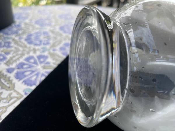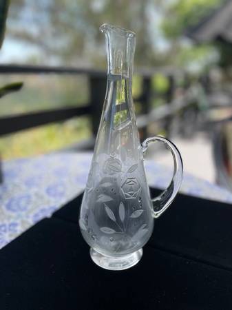 Vintage Roumanian etched glass wine decanter (no stopper). This decanter has an etched floral design and is excellent condition. It is 11" high with a depth of 5".