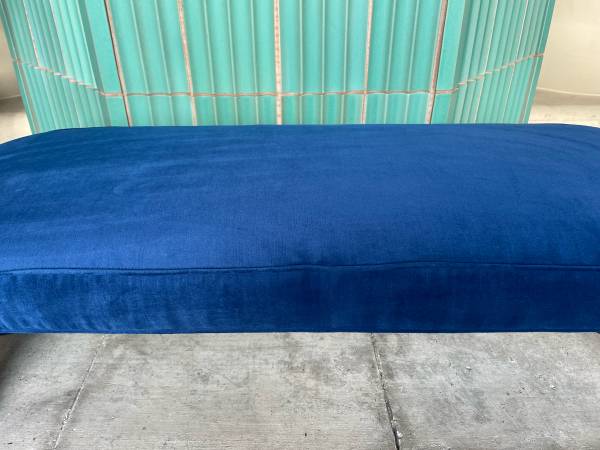 Vintage waterfall bench in the style of Karl Springer, newly upholstered in luscious deep blue velvet.